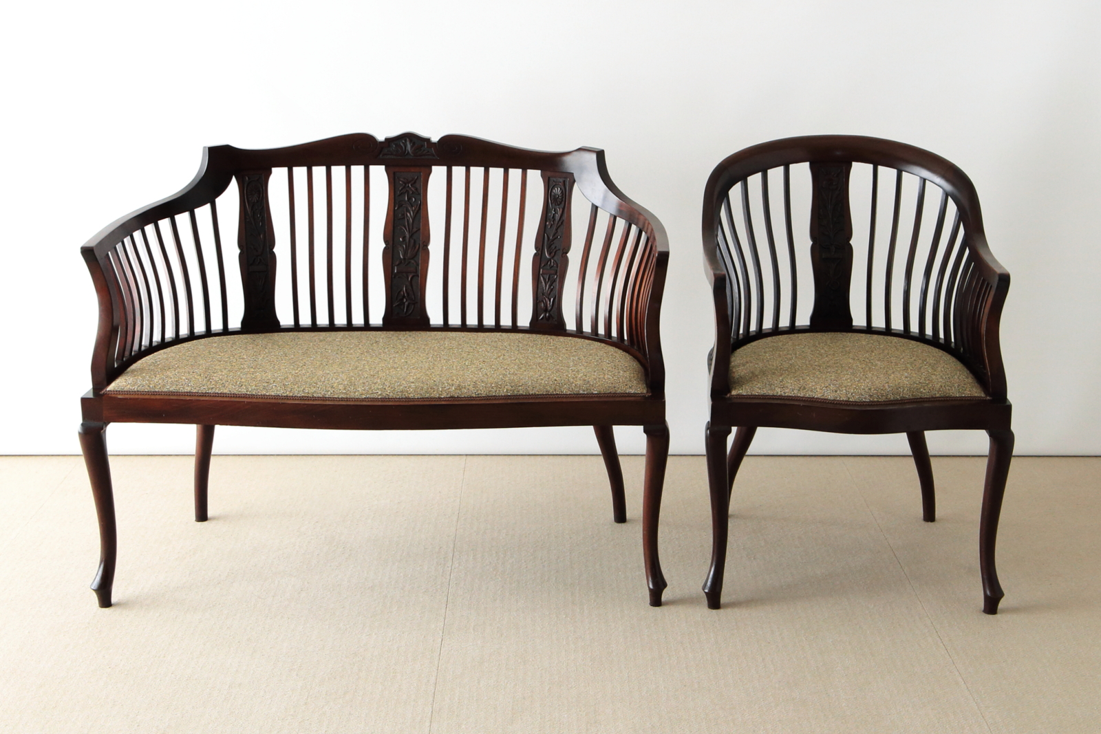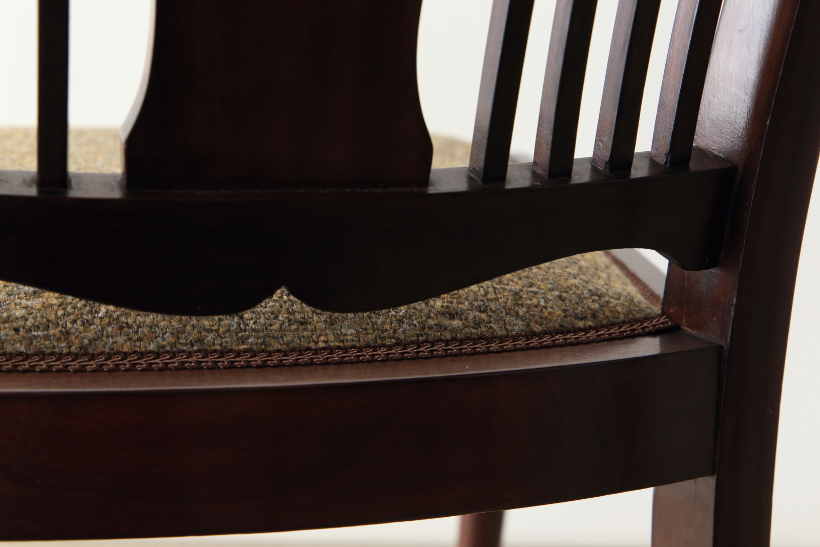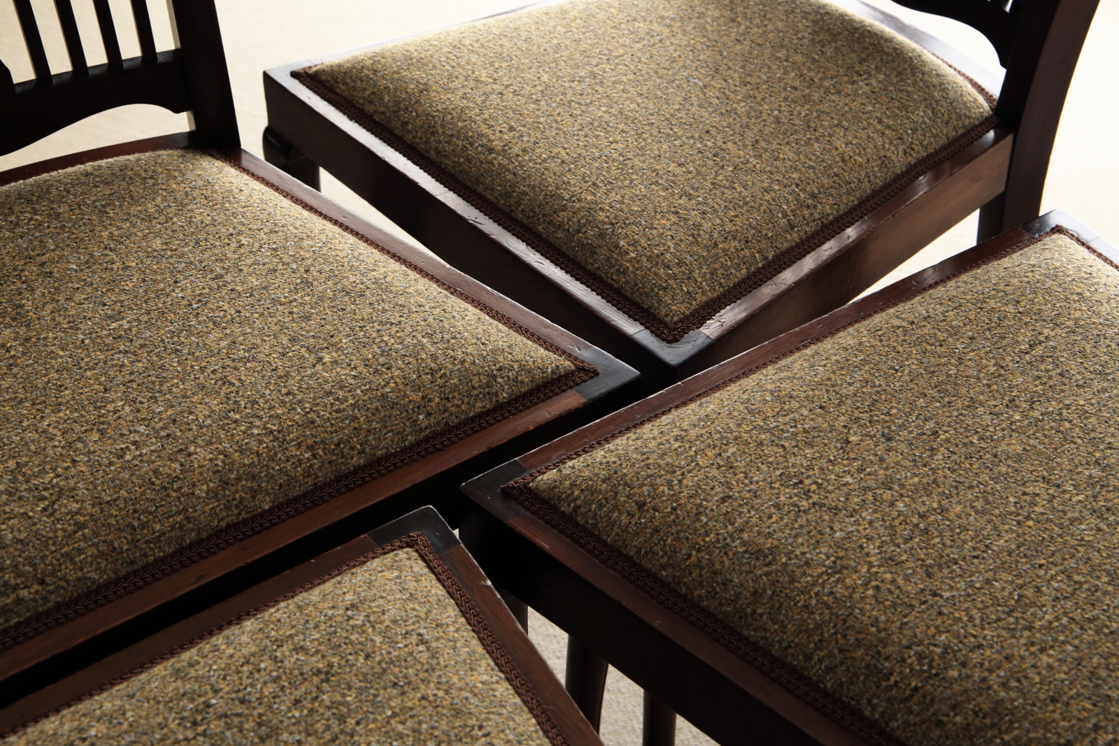 アームチェア(2人掛けと1人掛け)とダイニングチェア 神戸市西区 2人掛けと1人掛けのアームチェアと、ダイニングチェアの張替え。 木部の美しい曲線が印象的な椅子でした。 脚が細くて華奢な感じがしますが、 しっかりとした作りで接合部の緩みもありませんでした。 グリーンとベージュ系の色味が混ざったウールタッチの生地に、茶色の装飾縁で仕上げました。 PREV 一覧 NEXT