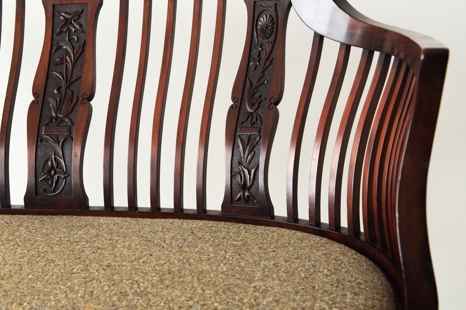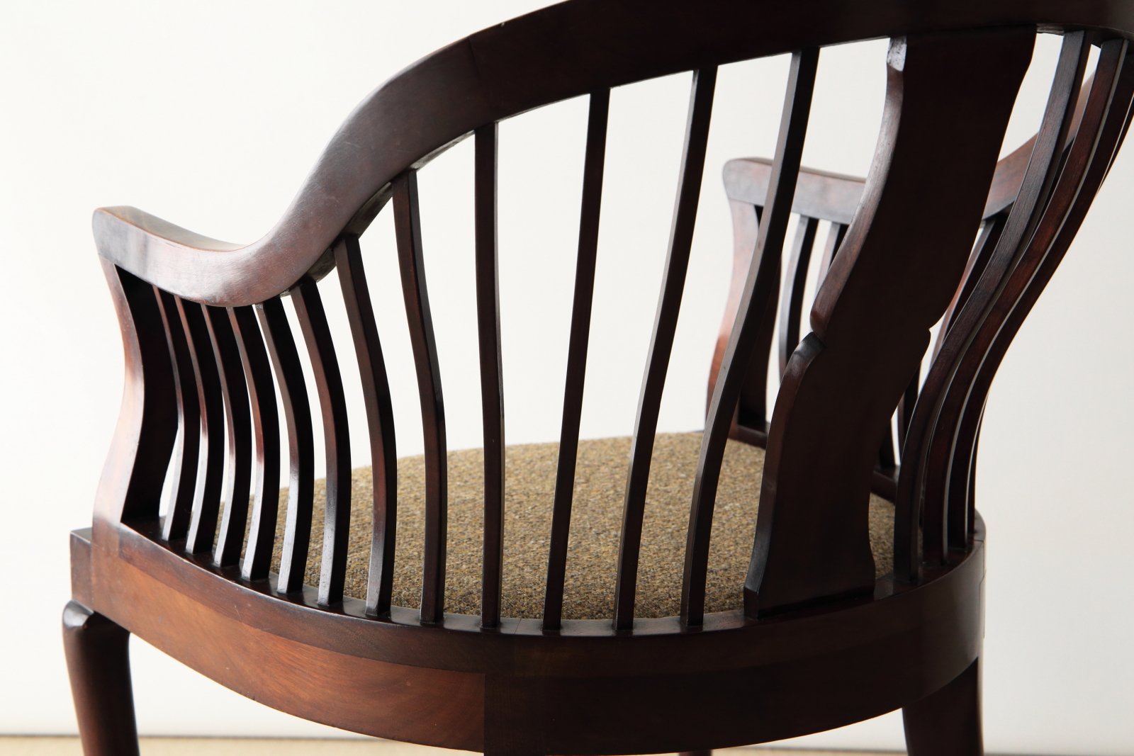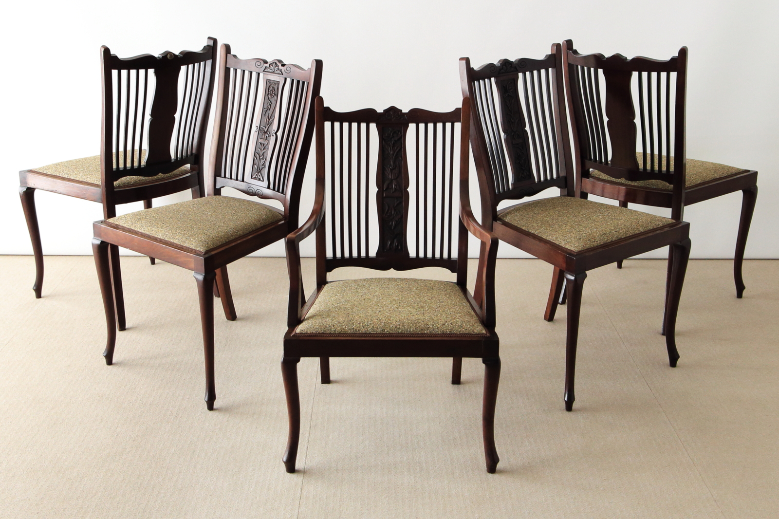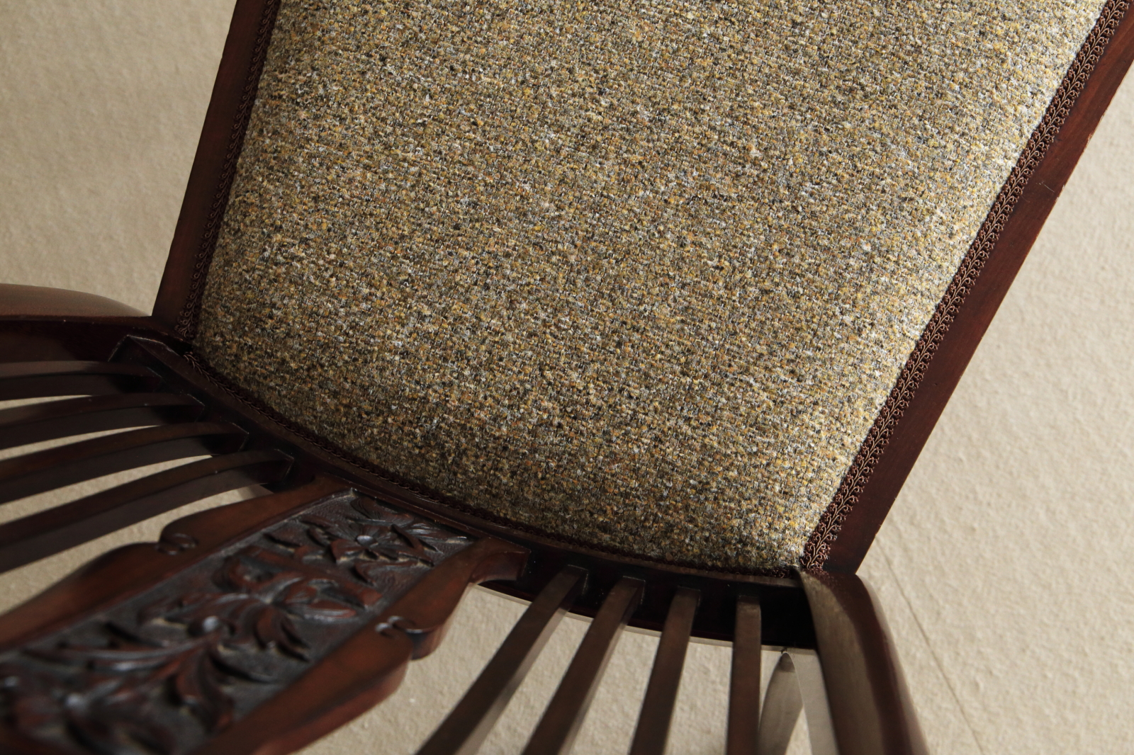 アームチェア(2人掛けと1人掛け)とダイニングチェア 神戸市西区 2人掛けと1人掛けのアームチェアと、ダイニングチェアの張替え。 木部の美しい曲線が印象的な椅子でした。 脚が細くて華奢な感じがしますが、 しっかりとした作りで接合部の緩みもありませんでした。 グリーンとベージュ系の色味が混ざったウールタッチの生地に、茶色の装飾縁で仕上げました。 PREV 一覧 NEXT